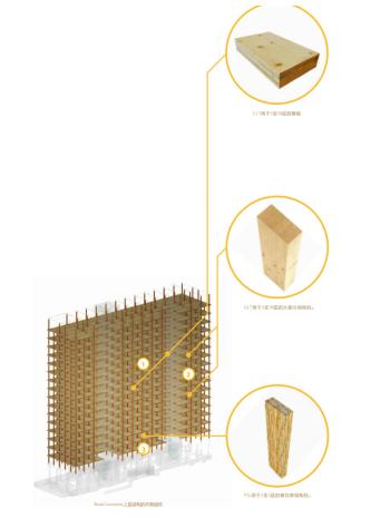在此項(xiàng)目中大量了使用了工程木產(chǎn)品,如層板膠合木(GLT)、正交膠合木(CLT)、平行木片膠合木(PSL)、釘接膠合木(NLT)、單板層積膠合木(LVL)、層疊木片膠合木(LSL)、定向刨花板(OSB)。
